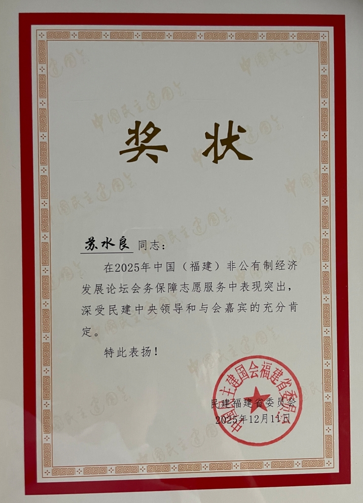 苏水良荣获在2025年中国(福建)非公有制经济发展论坛会务保障志愿服务嘉奖